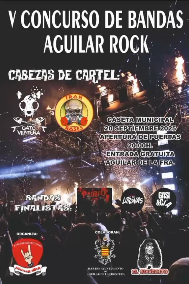 La Asociación Aguilar Rock ha dado a conocer el cartel del V Concurso de Bandas Aguilar Rock que se celebrará el próximo 20 de septiembre en el Recinto Ferial del Castillo (caseta municipal). En total serán 5 los grupos actuantes en esta final. La entrada es gratuita.