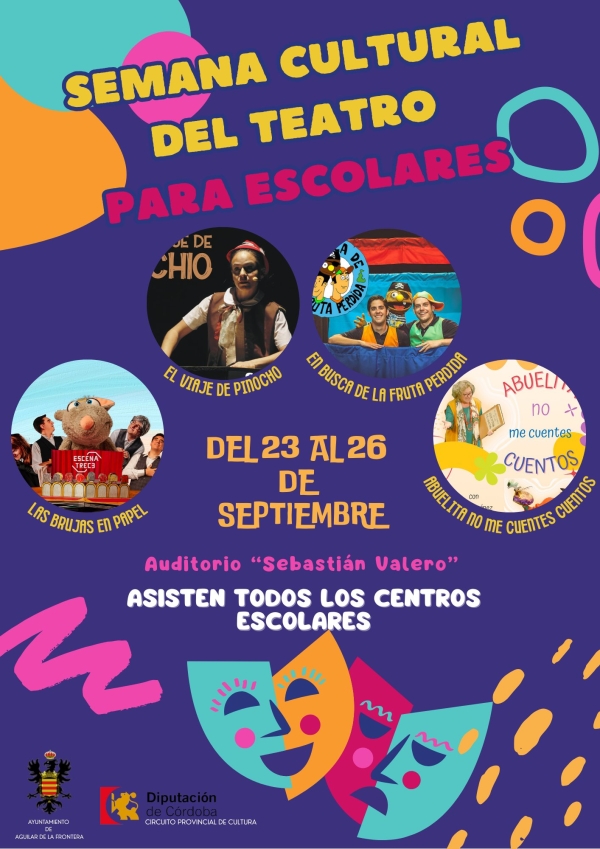 Del 23 al 26 de septiembre los escolares de todos los centros educativos de Aguilar de la Frontera tendrán la oportunidad de disfrutar de una variada programación de teatro, en el marco de la Semana Cultural del Teatro para Escolares.