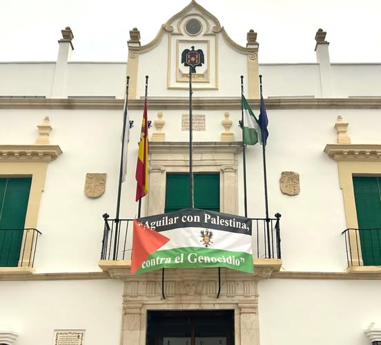 El Ayuntamiento de Aguilar de la Frontera ha colocado en su fachada la bandera de Palestina, acompañada del mensaje: “Aguilar con Palestina, contra el genocidio”.