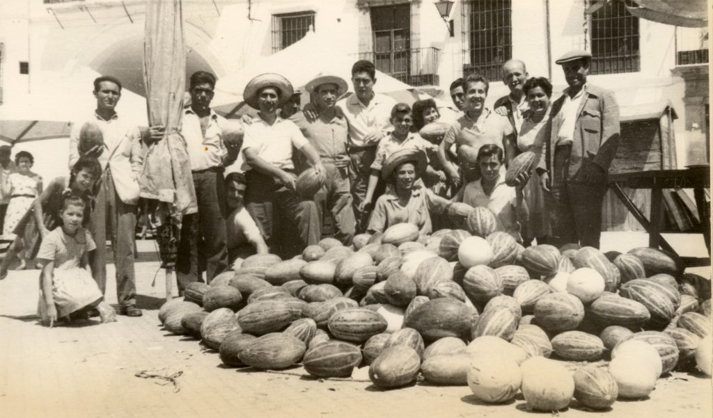 Eran los últimos años de la década central del siglo XX y la monumental Plaza de San José mantenía aún su fin originario como recinto del Mercado de Abastos del pueblo para lo que fue creada en 1810. Y llegado los meses del verano, resaltaba en ella la figura del melonero como parte esencial del paisaje estival. Estos trabajadores, dedicados al cultivo, cosecha y venta del melón, representaban una forma de vida marcada por el esfuerzo, la sencillez y la estrecha relación con la tierra.