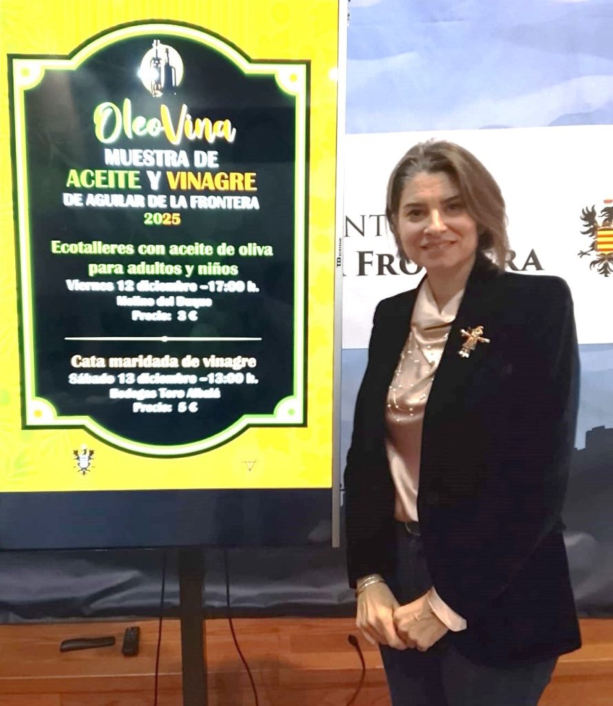 La concejala de Desarrollo Económico, Paqui Herrador, ha presentado una nueva edición de Oleovina, una iniciativa que pretende reconocer y difundir uno de los mayores tesoros de Aguilar de la Frontera: su aceite de oliva virgen extra y sus vinagres, productos estrechamente ligados a nuestra economía, a nuestra identidad y a nuestra cultura local.