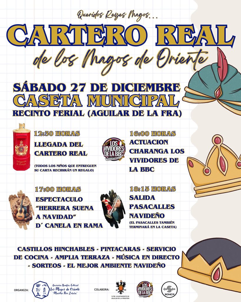 La Asociación Los Magos de Oriente (maestro Paco Zurera) celebrarán la llegada del Cartero Real de sus Majestades a Aguilar con una gran fiesta en la Caseta Municipal, en la que pequeños y mayores podrán disfrutar de una jornada inolvidable de convivencia.