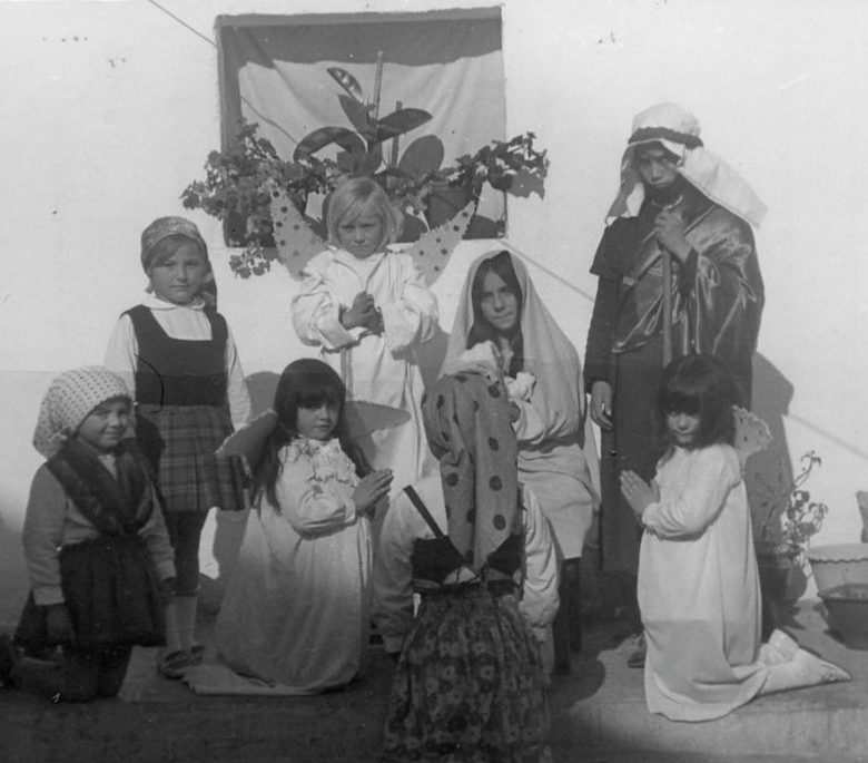 Con esta entrañable fotografía, tomada a mediados del pasado siglo XX, del Belén Viviente instalado en el patio de las escuelas de la calle Calvario, queremos compartir un recuerdo lleno